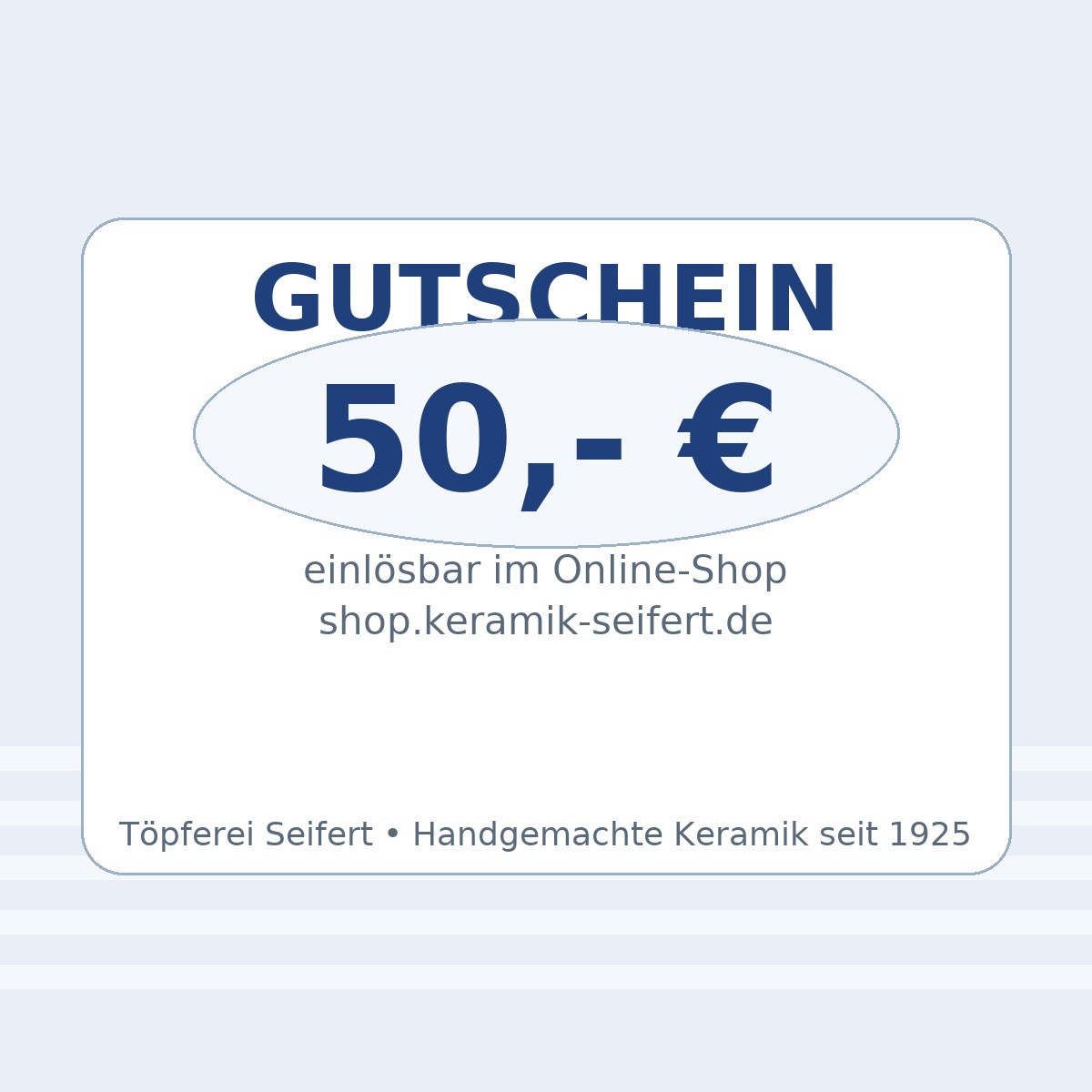 Mit dem 50 € Gutschein von Töpferei Seifert triffst du jeden Geschmack – von Bembeln und Tassen bis zu Schalen, Dosen und Unikaten. Der Beschenkte wählt in Ruhe aus und findet genau das Lieblingsstück.
