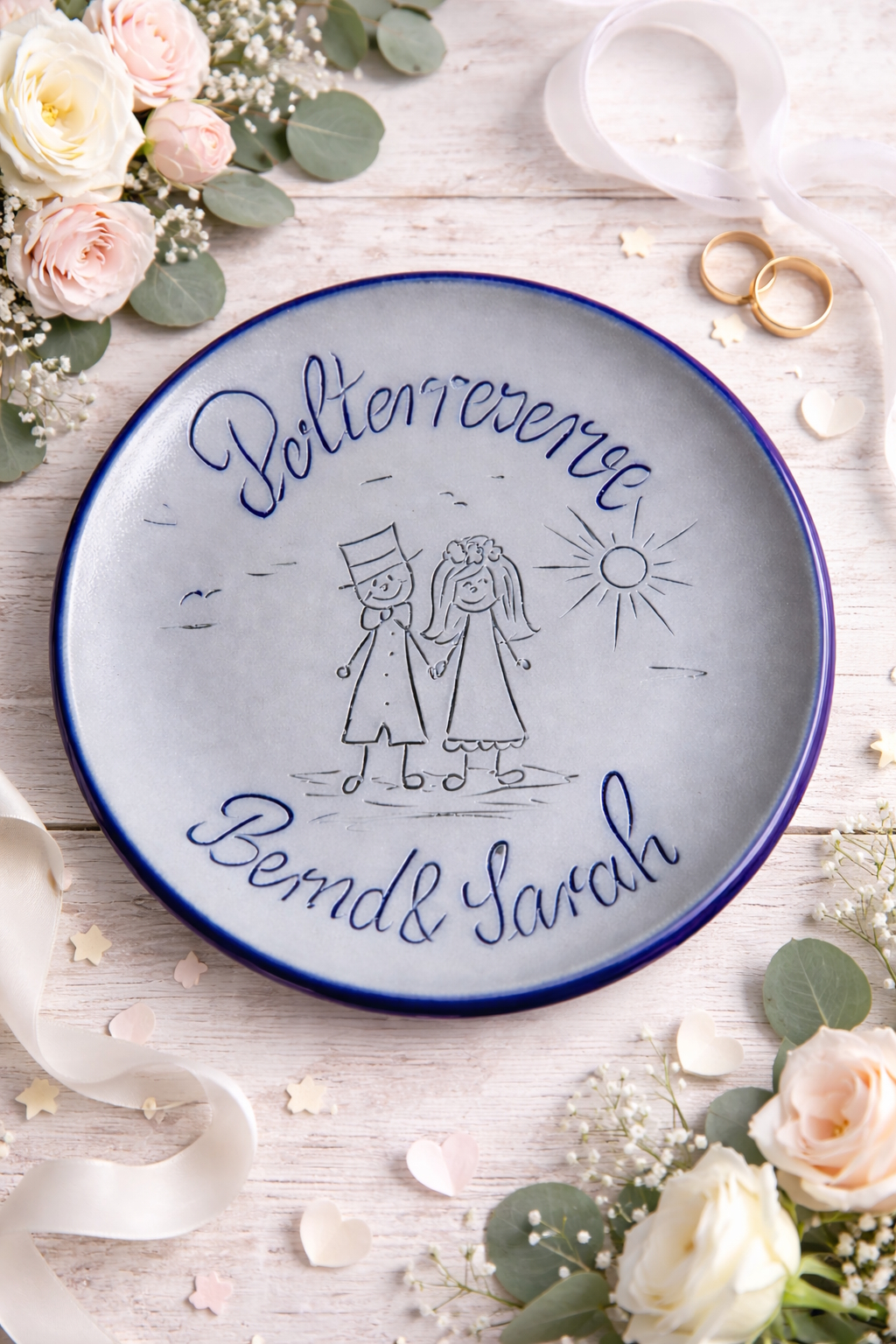 Dieser Polterreserve Teller ist eine besondere Geschenkidee zur Hochzeit, zum Polterabend oder als bleibende Erinnerung an einen unvergesslichen Tag. Durch die persönliche Gestaltung mit Namen wird jeder Teller zu einem individuellen Einzelstück mit besonderem Charme.